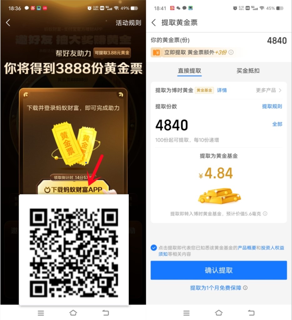 打开“支付宝”APP扫描截图上二维码,点击弹窗下载蚂蚁财富app,并且打开app进去活动里可以直接领到3888份黄金票(价值3.8元现金),然后还可以抽奖几次,加起来必得4元以上黄金、和实物,最后直接去提取黄金,过两天就可以卖出提现